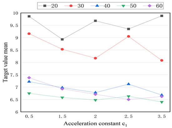 The initial inertia coefficient of the algorithm is set to wmax = 0.9, wmin = 0.1. The maximum number of iterations of the particle swarm is S = 1000; for comparability, in this paper, the acceleration constants are taken as, respectively, c1= {0.5, 1.5, 2.0, 2.5, 3.5} and c1 + c2 = 4.0, and the scale of the particle swarm is taken as, respectively, R = 20,30,40,50,60; a total of 5 × 5 groups of parameter combinations are tested. For the calculation example where (number of PC slabs, number of storage racks) is (60, 10), each group of data was tested 10 times, and the average target value was counted. The results are shown in Figure 6.