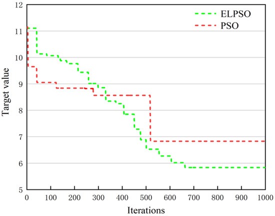 Figure 7 compares the convergence curves of the two algorithms, PSO and ELPSO, for the example where (number of PC slabs, number of storage racks) is (60, 10). When the number of iteration steps is small, the convergence curves of both algorithms decrease significantly, but PSO quickly falls into the local optimum while ELPSO, under the control of the elite learning strategy, continues to maintain a downward trend in its convergence curve. The target value position tends to converge. It is shown that the improved PSO algorithm (ELPSO), through the elite learning strategy, can get a better solution on the target.