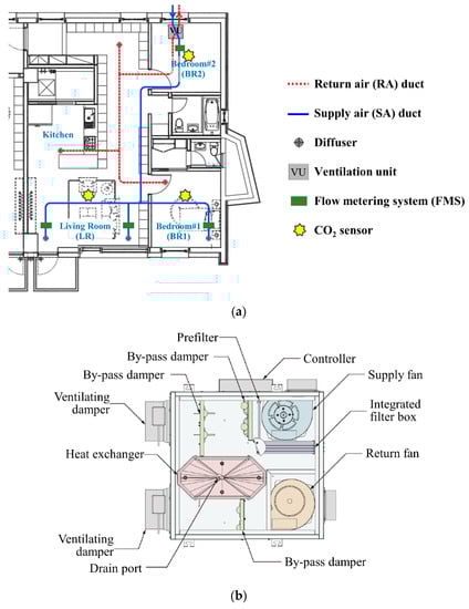 The target space is a 59 m2 apartment unit (Figure 1a), the representative size of South Korean apartments. The target space consists of a living room (LR), a kitchen, and two bedrooms (BR1 and BR2) with LR and BR1 on the southern side and BR2 on the northern side. A set of diffusers for the supply air (SA) and return air (RA) ducts were installed in BR1, and two sets of diffusers were installed in LR and the kitchen. The ventilation unit of the HRV (Figure 1b) installed in BR2 had a nominal flow rate of 150 CMH, which can support over 1 air change per hour (ACH) for a target space of 59 m2. The ventilation volume was controlled using a diffuser system with a variable air volume (VAV) (Figure 1c). The stepping motor integrated inside the diffuser cone rotated when an external controller sent operation commands to the diffuser controller via a RS 485 communication line []. Additionally, the ventilation volume for each room could be controlled by adjusting the speed of the SA and RA fans in the ventilation unit of the HRV and by controlling the opening rate of each diffuser.