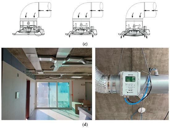 At the end of each SA duct, the flow metering system (FMS) (Figure 1d) measured the flow rate of each room. More specifically, the FMS measured the static pressure of the duct and calculated the flow rate based on the value of the self-averaging multipitot tube []. The measurement tolerances of the static pressure and airflow were 1% and 2–3%, respectively. Furthermore, three EE820 CO2 sensors, which were installed 1.5 m high in the center of each space, were connected to a data logger to measure the CO2 concentration in each room (Figure 1a). The measurement range of the EE820 CO2 sensor was 0–10,000 ppm, and its tolerance was 2%.