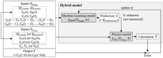 The hybrid model consists of a mass balance equation, which acts as the white box model, for determining the CO2 concentration of a single zone and a BNN, which acts as a black-box model. In particular, uncertainties exist in the mass balance equation owing to certain assumptions, such as the presence of well-mixed air, neglectable infiltration, and so on. Additionally, disregarding the airflow between multiple zones results in uncertainties. In this study, the uncertainties were aggregated and expressed as an input variable and then added to the mass balance equation. In the hybrid model, the BNN automatically estimates the aggregated uncertainties during the learning process and delivers them to the mass balance equation. In addition, the appropriate prediction horizon of the hybrid model was investigated, and the prediction performance of the hybrid model was compared with that of the standalone mass balance equation of a single-zone model.