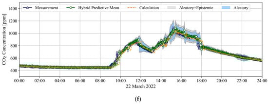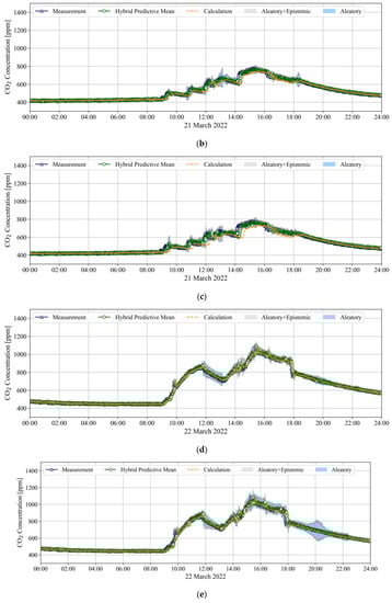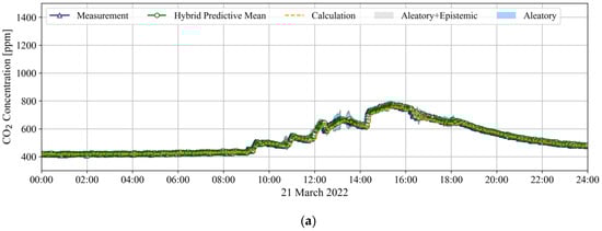 In addition, the results of the hybrid model indicated that predictive uncertainty increased as the prediction horizon increased. When the prediction horizons were 5, 10, and 15 min, the total predictive uncertainties, which are a combination of the aleatoric and epistemic uncertainties of the hybrid model related to LR were 17.66 (=15.32 + 2.34), 26.42 (=22.78 + 3.64), and 29.68 (=24.38 + 5.3) ppm, respectively, and those related to BR1 were 20.89 (=16.26 + 4.63), 35.03 (=28.11 + 6.92), and 44.24 (=33.03 + 11.21) ppm, respectively. Therefore, the predictive uncertainty of the hybrid model is expected to be applied toward the implementation of a robust MPC for an HRV.