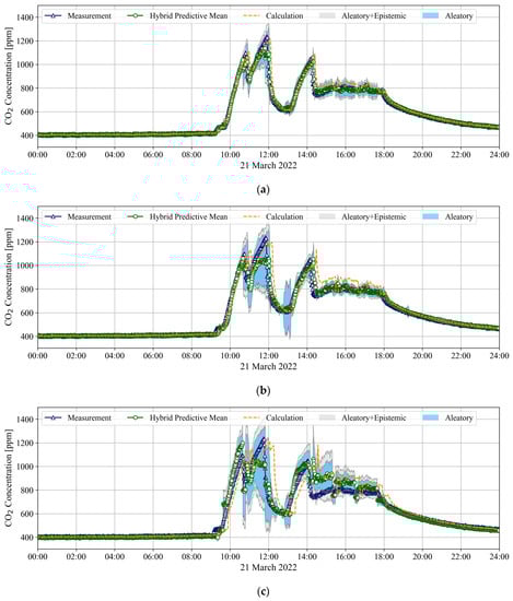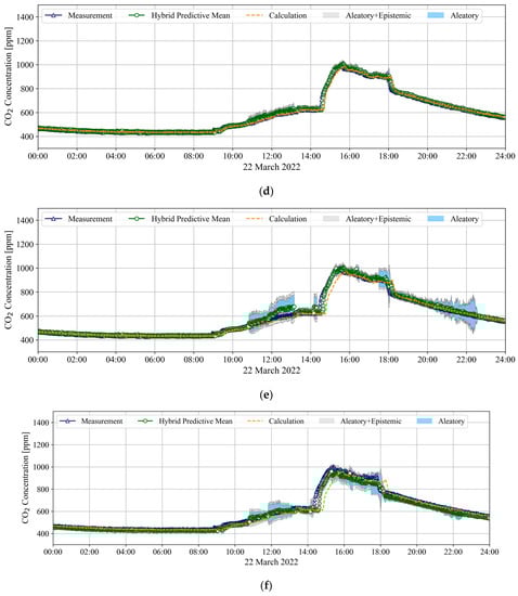 As shown in Figure 3 and Figure 4, since the mass balance equation (Equation (2)) cannot reflect the unknown and/or uncertain changes in the indoor environment during the prediction horizon of the model, the corresponding forecasting results are shifted according to the prediction horizon. In contrast, the BNN in the hybrid model estimated the aggregated unknown term by learning the relationship between the current and past CO2 concentrations (, ,…,, , ,…,) and the CO2 concentration after the prediction horizon ( or ), and the estimated was reflected in the mass balance equation (Equation (3)) of the hybrid model. Owing to the presence of , which is the only difference between the models, the forecasts of the hybrid model followed the changing trend of the measurement faster than the mass balance equation.