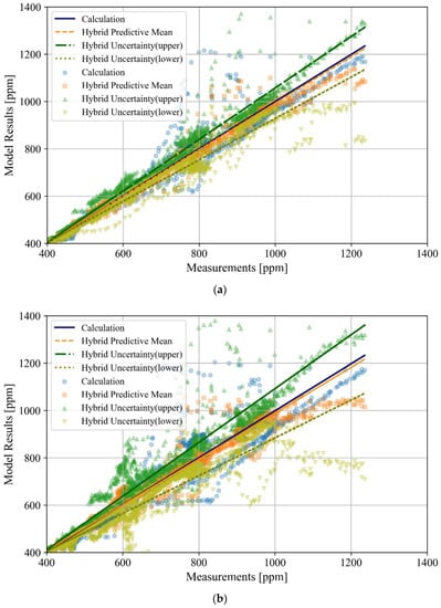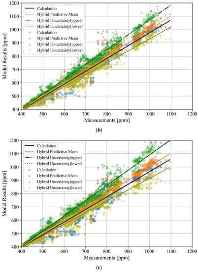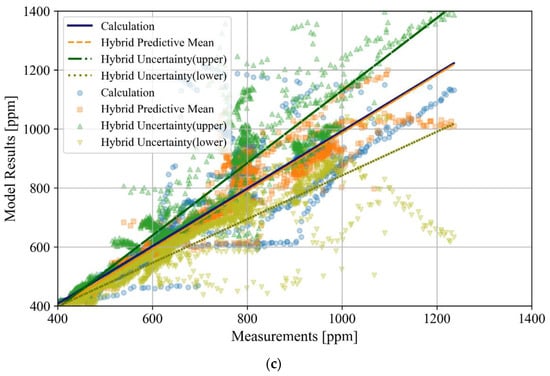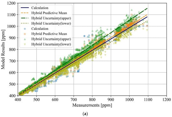 Figure 5 and Figure 6 display the scatter plots of the relationship between the measurement and forecasting results obtained using the hybrid model and mass balance equation for the LR and BR1 zones. In particular, the results obtained using the hybrid model can be represented as the predictive mean and upper and lower boundaries of the total uncertainty, which includes the aleatoric and epistemic uncertainties. In the scatter plots, the relationships between the measurements and results obtained from each model are represented by a line plotted using first-order linear regression.