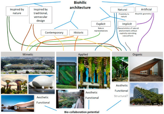 Biophilic design approach aims at creating favorable conditions for humans in various types of anthropogenic environments, while at the same time restoring broken human–nature connection. The biophilic design guidelines and principles are general and flexible and allow wide array of architectural expressions. In order to better understand the architectural expression possibilities provided by biophilic design approach, the existing classifications of biophilic architecture and biophilic design examples were analyzed with the aim to develop the classification that would reflect the links between a building’s architectural expression and biophilic qualities. Three categories of biophilic architecture were distinguished in the developed classification: mimetic, applied, and organic. The distinguished categories were illustrated with the characteristic building examples and the evaluation of biophilic qualities and human-nature collaboration potential of these example buildings was carried out using comprehensive system of criteria. The analysis has demonstrated that all three distinguished categories—mimetic, applied, organic—allow for the creation of biophilic environments and hold the potential for human–nature collaboration, although organic biophilic design would be currently considered as the least developed, although most promising category.