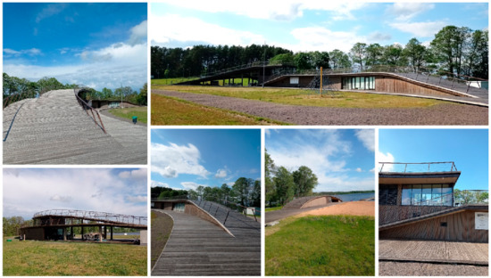 Recreation and Water Center in Zarasai. The object nicely integrates man-made structure and natural landscape. The architectural structure connects land and water. The question may arise about whether it is a building, a bridge, or a path. Structural variety offers possibilities to touch the water or to feel the wind breeze, shade, and sun. Although ecological systems such as habitats, rare plant species, nectar rich local vegetation, and others are not integrated in the project on purpose, it offers visual continuity of a man–nature made landscape, and opportunities to find fauna life in the trees or the lake.