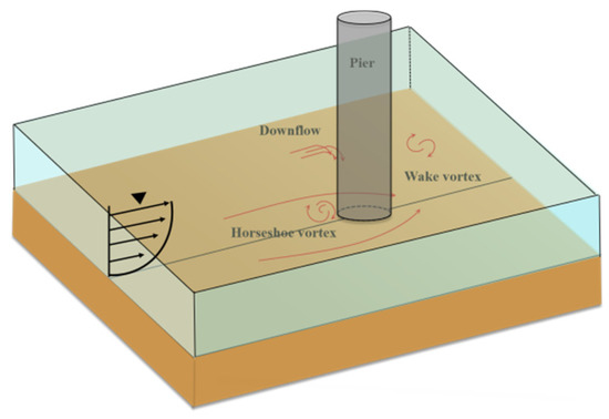 Local scour around the pier is the main cause of bridge failures [1,2,3,4,5]. Previous studies showed that horseshoe and down-flow are leading concerns for scouring hole creation around the bridge pier. Due to the turbulent fluctuations and accelerated flow, the sediment will be entrained and transported, which will lead to a reduction in the embedment depth and insufficient bearing capacity of the pier. The creation mechanisms of horseshoe and down-flow due to the collision of flow with the bridge pier are presented in Figure 1. In this case, there is a growing body of scholars that recognize the importance of local scour [6,7,8,9]. However, there is an urgent need to understand the characteristics of the flow fields around the bridge pier and the scour mechanisms, in parallel, to propose different counter measures to control and reduce local scour around the bridge pier.
