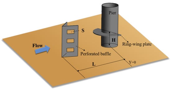 As presented in Figure 2, the experimental setups in this paper include a circle pier and combined device. As for the combined device, the front end of the perforated baffle is located at a distance of L from the center of the pier and the ratio of perforated area is S. The ring-wing plate is at H, which is fixed on the pier. Of note, Huang et al. obtained the optimal parameters of the surface guide panels, which are the interior angle of θ = 60° with L/D = 2 − 2.5 [24]. Similarly, Wang et al. retrofitted 60° of V-shaped baffle with a wing plate to enhance the anti-scour effect on a circle pier [25]. In view of the above experience, the angle of the perforated baffle in this paper is determined to be 60°, namely, the angle is not regarded as an optimization parameter. Based on the outcomes of Cheng et al. [23], the extension length of the ring-wing plate is consistent with the radius of the pier, and three values of H are considered for 1/2, 1/3, 1/6h.
