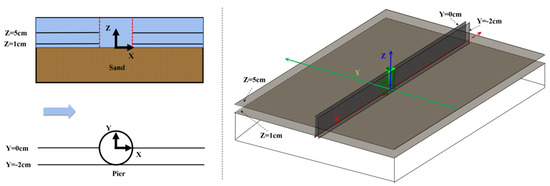 As indicated in Figure 3, the interface of water and sand is set as Z = 0. In addition, to observe the flow characteristics clearly, there are two horizontal (Z = 1 cm and Z = 5 cm) and two vertical (Y = 0 cm and Y = −2 cm) planes set in the flow field.