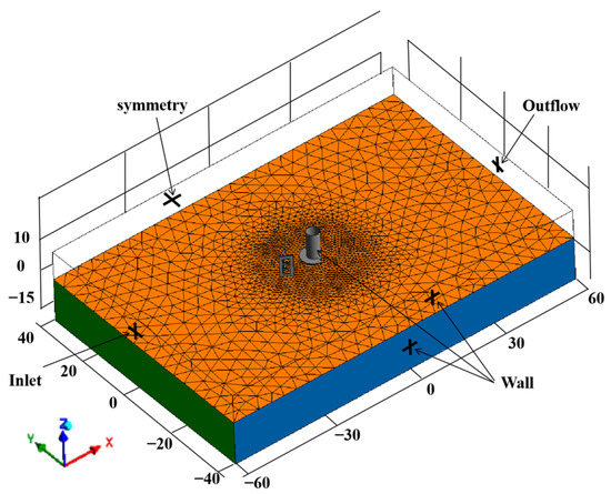 The boundary conditions of the computational domain are as follows: The velocity inlet (v = 0.25 m/s) and outflow are 0.6 m away from the pier. The walls on both sides are 0.4 m away from the pier, except for the three components of velocity, all quantities adopt the zero-gradient condition. The top boundary is defined as symmetry. In addition, the perforated baffle, ring-wing plate, and pier are defined as “wall”. To achieve the hydraulically smooth surface, the roughness of the “wall” is maintained as sufficiently small (ks = 1 × 10−5 m).