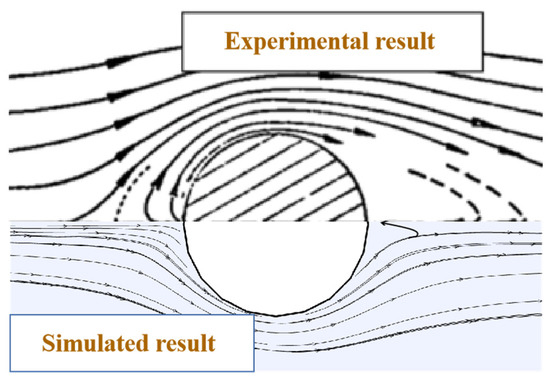 Figure 5 shows the comparison of simulated and experimental results of streamlines near the riverbed. Compared with Melville and Raudkivi flume test results [28], it can be seen that the position of the simulated streamlines around the front side of the pier and the separation point on the back are similar to the experiment result. Specifically, there is a similar backflow area in the wake of the pier.