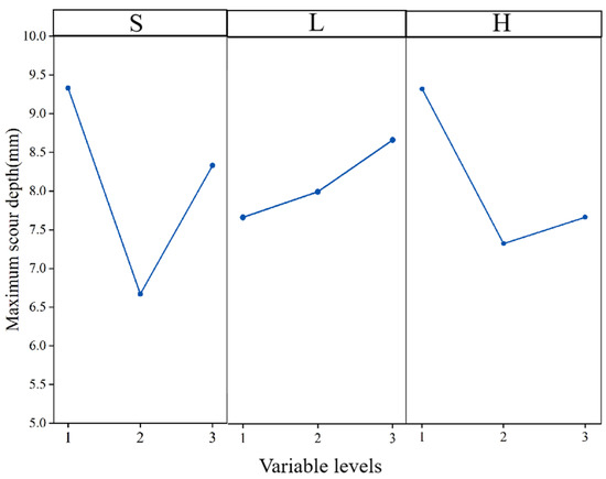 Furthermore, the main-effect plots are illustrated in Figure 6. It can be seen that the variable ranked first is S, and the sequence of the impact of all other variables on the maximum scour depth reduction can be listed as H > L.