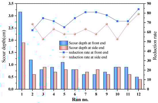 To further illustrate the anti-scour effect of combined device, the scour depth and reduction rate for all the conditions are shown in Figure 7. As can be seen, under the protection of the combined device, scour depth at the front and side end of the pier are reduced significantly at the same time. In contrast, the values at the front and side of the pier are closer, which shows that the riverbed around the pier is well protected together. The average scour hole is less likely to cause bridge safety accidents. Of note, in the results of run no. 12, the maximum scour depth at the front and side end of the pier reduced by 84.20% and 78.95%, respectively, which is better than the single ring-wing plate and other combined conditions in the orthogonal experiment. This not only shows the reliability of the orthogonal experiment, but also shows the excellent anti-scour performance of this device.