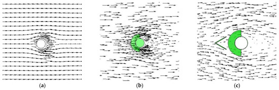 Velocity vectors at Y = 0. (a) Single pier; (b) Pier with ring-wing plate; (c) Pier with combined device.