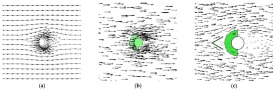 Velocity vectors at Z = 5 cm. (a) Single pier; (b) Pier with ring-wing plate; (c) Pier with combined device.