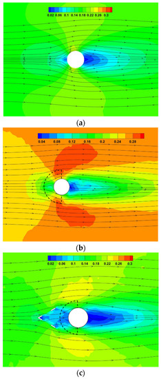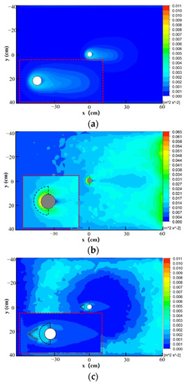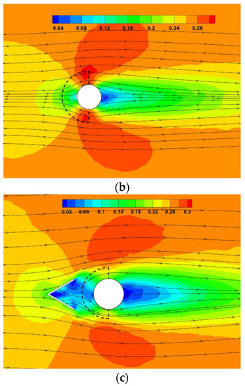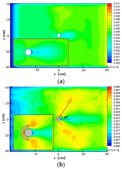 Figure 12 and Figure 13 show the turbulent kinetic energy at Z = 1 cm and Z = 5 cm, respectively. On the whole, the turbulent kinetic energy near the bed (Z = 1 cm) is significantly greater than Z = 5 cm. As shown in Figure 13a, there is a small turbulent kinetic energy within 8d behind the pier, and the region is oval. After the installation of the ring-wing plate, a region of high turbulent kinetic energy appears in front of the pier at these two planes. In addition, at the sides of the pier near the bed, a discontinuous band of high turbulence region with 60° to the incoming flow direction appears, which is shown in the dashed line. Of note, a very important conclusion is that the presence of the ring-wing plate makes the flow around the pier interact more strongly with the incoming flow, creating more vortices in the boundary separation direction. As indicated in Figure 12c and Figure 13c, the turbulent kinetic energy around the pier at both planes is greatly decreased. Indeed, the low turbulent kinetic energy region presents a circle with a radius of about 20 cm. At the plane of Z = 1 cm, there is a low turbulent kinetic energy region with a length of about 4d behind the pier. Of note, the turbulence kinetic energy behind the baffle is about 0, which is a rational consequence of the blocking effect of perforated baffle and pier.