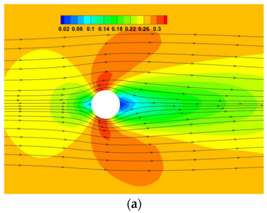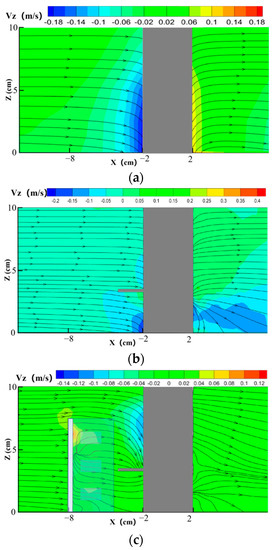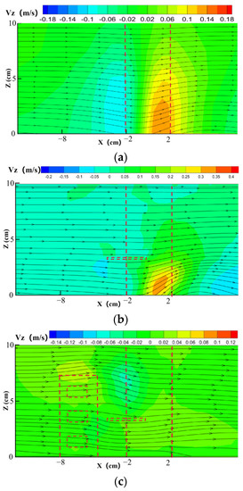 Figure 14 and Figure 15 show the velocity vectors around the pier at the XZ plane (Y = 0) under three conditions. Figure 16 and Figure 17 show the streamlines around the pier with the vertical velocity contour in the background. As can be seen in Figure 14a and Figure 15a, under the free surface, the velocity decreases and consequently the pressure increases as the flow approaches the pier. Moreover, the increase in pressure decreases in a vertical downwards direction. Owing to the approaching boundary layer flow, an adverse pressure gradient on the upstream face of the pier in the vertical direction is formed by this difference in the pressure. Consequently, a down-flow on the upstream face of the pier is generated. On the side, the trend of down-flow in front of the pier is weakened, while behind the pier, the flow shows an upward trend of acceleration.