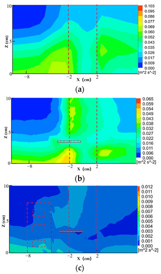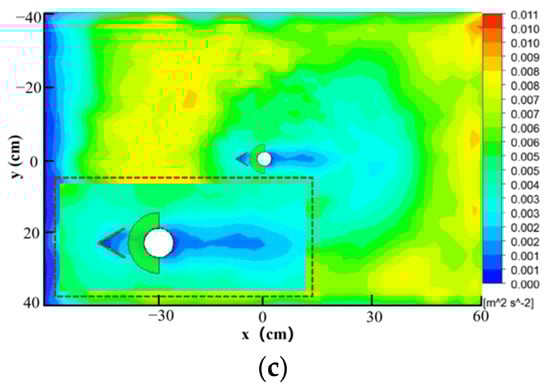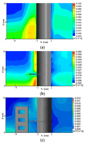 Turbulence kinetic energy at Y = −2 cm. (a) Single pier; (b) Pier with ring-wing plate; (c) Pier with combined device.