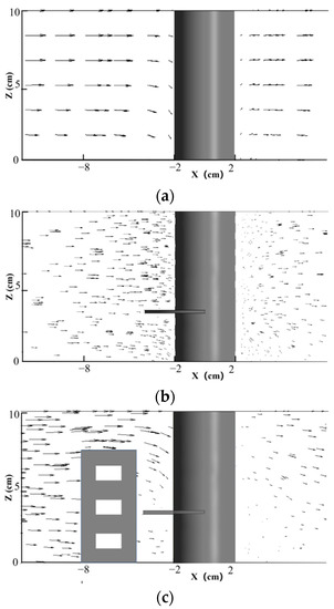 As expected, after installing the perforated baffle, the flow structure dramatically changes upstream of the pier, which is shown in Figure 16c and Figure 17c. Another significant outcome that can be drawn here is that there is an upward flow at the upper end of the perforated baffle. More specifically, a wake region forms behind the perforated baffle. These wake vortices and upward flow prevent the down-flow from impinging on the riverbed upstream of the pier. In addition, the horseshoe vortices are disturbed by this wake. Therefore, the reduction in scour depth can be attributed to these changes in the flow field around the pier.