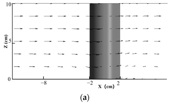 In this section, the numerical results for three conditions are presented. Figure 8 and Figure 9 show the velocity vectors at Z = 1 cm and Z = 5 cm. As can be seen, the magnitude and direction of the velocity vectors are (u2 + v2)0.5 and arctan (v/u), respectively. Since the flow field changes mainly occur around the bridge pier and protective devices, only the local test results are shown.