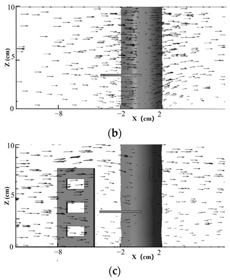 Under the protection of the combined device, the velocity vectors around the pier are presented in Figure 8c and Figure 9c. Of note, the perforated baffle upstream of the pier is able to weaken the horseshoe vortex by diverting a part of the near-bed flow and decreasing the velocity of incoming flow. As can be seen, the flow around the pier and the vortex downstream of the pier are greatly reduced, which induces lower bed shear stress. When the bed shear stress is less than the critical shear stress, the material on the bed surface may not be scoured.