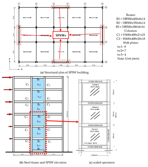 The plan for the prototype was based on a regular six-story structural SPSW and steel-frame system, as seen in Figure 1a. Hence, the prototype incorporated a steel structure composed of steel-frame and the perimeter steel shear walls, with typically six stories. Each story height is 3.6 m. Dimensions of the structural plan are 24 m in the x-direction and 16 m in the y-direction.