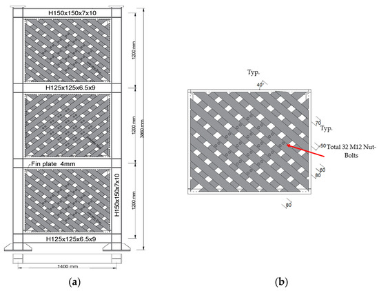 The designing of the infill web plates, column, beam, and intermediary boundary components and the plate’s widths to thickness ratio meet with the AISC 341 [36]. AISC and FEMA 450 [30,31] estimate the design shear stress of the infill webs plate, , using Equation (6). Additionally, the columns and beams were constructed to make it conceivable to build the entire tension field action of the infill plate. According to the recommendations of AISC 341 Seismic Provisions, the columns were designed with the proper bending and shear capacities to resist the tension field created by the infill web plate. Equations (7) and (8).