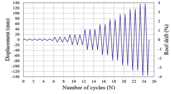 The top of each column was subjected to a 100 kN gravity force before any lateral loads were applied. This load remained consistent throughout the entire experiment. The experimental specimens were loaded laterally using a displacement control method applied in a cyclic quasi-static manner. For cyclic loading, the Applied Technology Council ATC-24’s recommended loading history was used [32]. As demonstrated in Figure 5, the loading displacement history of the test specimens featured a step-by-step increment in the deformation cycles. Displacements began at 0.08% roof drift (3.096 mm) and subsequently increased to 3.3% roof drift (116.1 mm). Story drift is calculated based on the maximum roof displacement divided by wall height (=).
