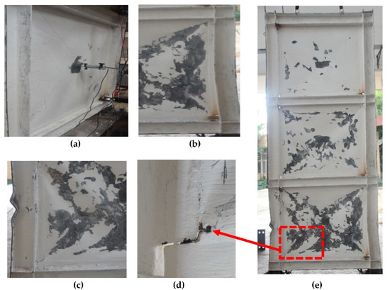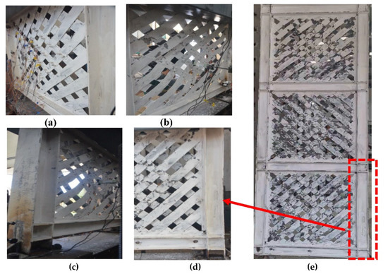 During the first six loading cycles, evaluation of the infill strips revealed no buckling or yielding. Buckling and minor yielding occurred in the infill web-strip of the flooring during loading cycles 7, 8, and 9 (Figure 7)). In cycle 10, the infill web-strips initially yielded at a horizontal displacement of (9.675 mm), and the load was 82.2 kN. In cycle 10, minor paint flaking was detected on the infill strips near the junction of the horizontal and vertical fish plates on the first and second floors. The magnitude and area of the out-of-plane deformation infill plates increased on the second and third floors during cycles 11 and 12. In cycles 13–14 and 15, flaking increased in the top-left of the second floor’s infill plate and the bottom-left of the third floor’s infill plate (Figure 8b). Cycle 13 had a lateral displacement of 19.35 mm and a shear force of 162.5 kN, respectively. In cycle 15, an increase in flaking of the whitewash on the infill plate of floors was noted. During this cycle, the whitewash flaked to the extent that it covered the whole infill web strips. Moreover, the first-floor columns started to yield.
