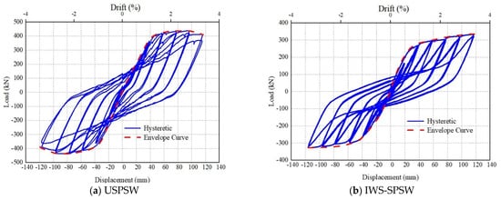 The hysteretic behavior of the specimens’ IWS-SPSW, USPSW, and envelope curves are shown in Figure 8. Hysteresis loops exhibited essential characteristics, including strength, stiffness, ductility, dissipated energy, and the behavior of specimens observed in the tests. According to Figure 8, all parts of the infill plate participated in the energy dissipation of the system, and the model had centering and stable hysteresis loops. In the early (elastic) loading cycles, the panel behaves stiffly. In specimen USPSW, as the deformations increase, portions of the yield gradually reduce stiffness. After significant yielding of the infill panels has occurred, unloading and reloading in the opposite direction produce a consistent and characteristic hysteresis pattern. The maximum load achieved in each cycle increased slightly with each excursion to a new deflection level until the maximum base shear of 438.2 kN was reached in cycle 20. This took place at a deflection of 97 mm. Subsequently, the shear wall’s load-carrying capacity declined gradually from cycle to cycle. Cycle 22 was also the cycle where panel tears first occurred. Tearing and the local buckling in the column flanges that began forming in cycle 22 have contributed to the gradual degradation of the specimen. In specimen IWS-SPSW, a high initial stiffness with less energy dissipation was evident in the elastic region. In the post-yield area, several well-defined segments of the load-deformation curves represented the various loading, unloading, and reversal of the infill web-strips buckles. Increased energy dissipation was achieved with each displacement level increment in the post-yield region. Due to local damage, a decrease in energy dissipation between subsequent cycles at the same load level. The principal sequence of significant inelastic action in the single-panel specimens yielded the infill web strips and yielding the boundary frame. The envelope curve of the specimens was obtained by successively connecting the peak points of the hysteresis curve of the first cycle at each stage in the same direction. The IWS-SPSW specimens exhibited a stable ductile behavior that increased the load-carrying capacity continuously (Figure 8). The USPSW specimens, on the other hand, exhibited a gradually decreasing load-carrying capacity after the maximum load-carrying capacity was reached during the early loading stage).
