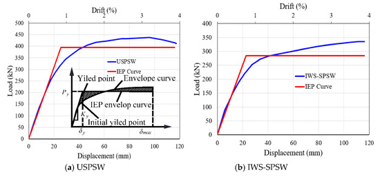 Figure 9 shows the result of the test specimens for the envelope curve of the load-displacement and the idealized elastoplastic (IEP) curve. Equal plastic energy is used to depict the idealized elastoplastic envelope curve [7]. The yield position is determined so that the area bounded by the test envelope and the idealized elastoplastic envelope curve are equal. In assessing the structural design and seismic performance, the displacement ductility characteristic () is defined as the maximum relative lateral displacement () to the maximum relative lateral displacement at the yield point (), or () sees (Figure 9a). Table 3 shows the specimens’ ductility values as calculated. The ductility values for the USPSW and IWS-SPSW were 4.54 and 5.15, respectively, and the IWS-SPSW showed high ductility. The yield point () for both test specimens was calculated from the envelope curves, approximately 0.70% and 0.61 % drift (roof displacement = 25.55 and 22.56 mm). The specimen ratios are equivalent to 0.85, suggesting better ductility.