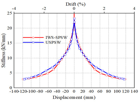 An idealized elastoplastic (IEP) curve and the load–displacement envelope curve of test specimen findings are shown in Figure 9. The IEP envelope curve is drawn using equal plastic energy [37,38]. The yield position is determined by comparing the area contained by the test envelope to the idealized elastoplastic envelope curve. Using the IEP curve, the initial stiffness of specimens (Kiy) is calculated as the force ratio to the elastic region’s displacement. As a result, the initial stiffness of USPSW and IWS-SPSW specimens is 15.42 and 12.62 kN/mm, respectively, as presented in Table 3. For the stiffness degradation, the stiffness secant is used to describe the stiffness degradation of the test specimens, as illustrated in Figure 10. Form an envelope curve; the stiffness secant equals the gradient of the line passing between (0,0) and point ith (δi, Pi); as displacement increases, specimen stiffness degrades, as shown in Figure 10.
