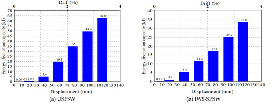 In the USPSW specimen cycle 22nd, the maximum peak energy dissipation was 62.8 kJ, measuring more than twice the IWS-SPSW 33.8 kJ because of the damage contribution of the first-floor column.