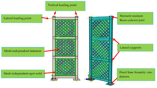 Based on the experimental data, FE models of SPSWs were subjected to boundary conditions, such as lateral support and cyclic lateral loading. In order to prevent the frame from moving out of the plane, the supports are moment-resistant and laterally supported, as shown in Figure 13. Practically, every panel has some manufacturing errors (i.e., they are not exactly flat). The plate’s mode shapes were determined using an eigenvalue buckling analysis. The FE model was modified with minor out-of-plane deformations corresponding to the panel’s lowest eigenmode (fundamental mode). The initial imperfection’s magnitude was limited to , where lp and hp reflect the plate’s length and height, respectively [43], this perturbation forms the diagonal tension field in the panel. It mitigates the ideally flat plate’s artificial over-stiffness. FE models used welded connections of restrained tie interactions to simulate the weld. The bolts connection of infill web-strips is defined based on defined mesh-independent fasteners [40]. As part of the SPSWs testing, the infill plate was connected to the boundary via the fin plate. In order to accomplish this goal, mesh-independent spot weld connection processes were implemented into the FE modeling of the fin plate.