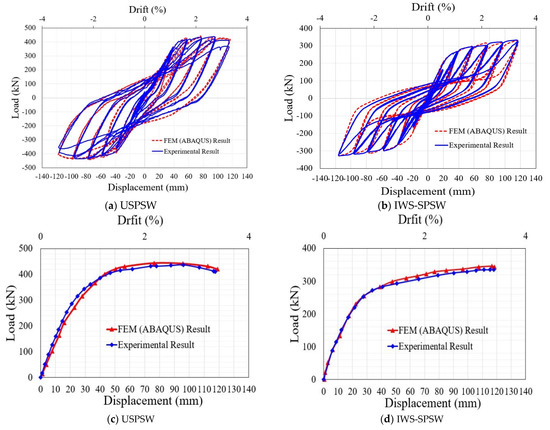 Comparison of hysteresis and envelope curves of tests and FE models: (a,c) USPSW, (b,d) IWS-SPSW.
