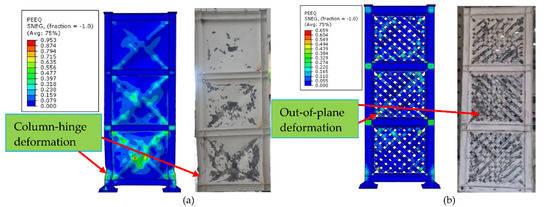The failure mechanism’s areas can be estimated using the equivalent plastic strain (PEEQ) [40]. FE models and test specimen failure modes are depicted in Figure 15 using the equivalent plastic strain (PEEQ) concentration. Figure 15 illustrates failure modes of infill plates caused by a maximum PEEQ finite element model on test specimens, including plastic hinges on columns, out-of-plane deformation of infill plates, and infill plate corners tearing. PEEQ results revealed that the FE models accurately predicted the likelihood of failure mechanisms in cyclic loads.