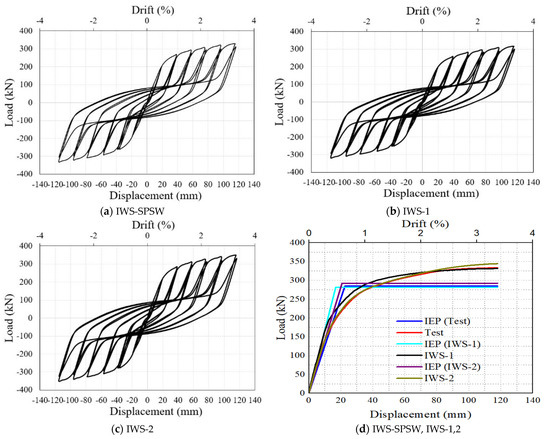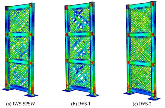 Figure 16a illustrates the von-mises stress response and post-buckling of test specimen (IWS-SPSW) with initial stiffness 12.32 (kN/mm) and 284.7, 334.93 kN yield and ultimate base shear as well as maximum strip deformation of 79.5 mm. Figure 16b, IWS-1 model was exhibited 16.76 (kN/mm) initial stiffness and 241.2, 331.10 kN yield, and ultimate base shear, respectively. At the loading end, the maximum strip deformation was measured 127.8 mm. Figure 16c represents the IWS-2 model with entire bi-diagonal strips bolt connections; the finding from the inelastic response showed an initial stiffness of 14.11(kN/mm) and 241.2, 331.10 kN yield, and ultimate base shear, respectively. The infill web-strips deformation was measured at the end of the loading analysis by 45.4 mm. The IWS-2 exhibited exemplary performance and high strength and ductility in comparing three FE models. Figure 17a–d represents each model’s hysteresis behavior, pushover curves, and idealized elastic to plastic (IEP) curves.