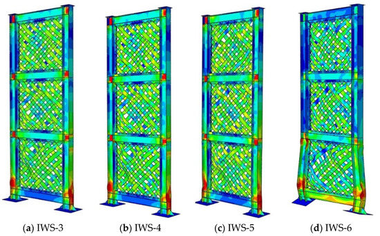 Figure 18b–d illustrates the model’s von-mises stress response and hysteresis behavior of the three models (IWS-4-5-6) with the same infill web strips width, vertical and horizontal loading, and different infill web-strips plate thickness. The IWS-4 model with 3 mm infill web-strips thickness exhibited an initial stiffness of 20.51 (kN/mm) and 356.35, 419.25 kN yield, and ultimate base shear, respectively. The IWS-5 model with 4 mm infill web-strips thickness displayed an initial stiffness of 24.32 (kN/mm) and 442.89, 521.04 kN yield and ultimate base shear force, respectively. The IWS-5 model observed an in-plane failure at the first-floor columns. Therefore, the hysteresis and envelope curves showed a slight deterioration after the lateral drift of 2.5 (%). The IWS-6 model with 5 mm infill web-strips thickness showed an initial stiffness of 30.89 (kN/mm) and 475.76, 559.72 kN yield and ultimate base shear load. In the IWS-6, an out-of-plane failure occurred after the 1.8 (%) lateral drift, which caused a sharp deterioration of the hysteresis and envelope curves.