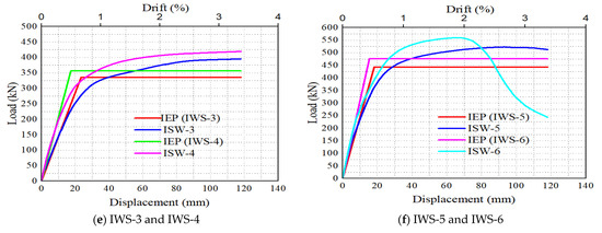 The IWS-4 model has exposed an excellent load-bearing capacity without any significant beam-column in-plane or out-of-plane deformation. On the other hand, the IWS-5 has displayed the best performance with a considerable in-plane of first-floor column failure. Finally, IWS-6 has shown remarkable performance in load-carrying capacity with more energy dissipation. It was revealed that by increasing the thickness of infill strips, the boundary elements experienced critical axial forces. The hysteresis loops, pushover, and IEP curves of IWS-3,4,5,6 models are shown in Figure 19.