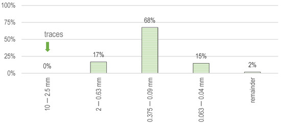 The content of dust and clay particles in the sand was about 1.8%; therefore, the sand was additionally washed and dried before the start of the research. The true density of the sand was 2.97 g/cm3.