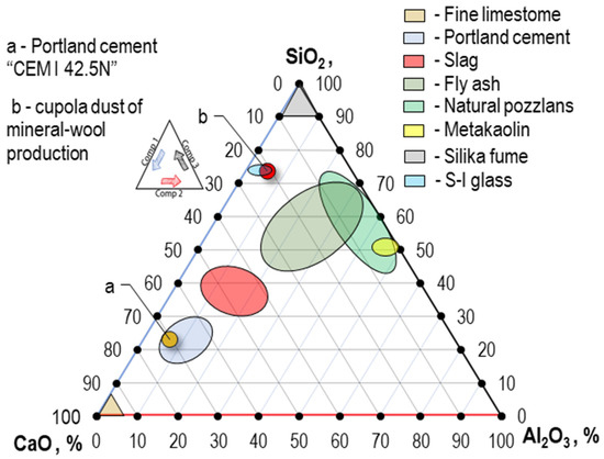 Figure 3 shows a three-axis diagram of the CaO-SiO2-Al2O3 system, indicating the points characteristic of Portland cement grade CEM I 42.5N and cupola dust. As the initial data for constructing this diagram, the data of the study of the phase transformation during alkaline activation were taken, in which a three-axis diagram is shown, indicating the raw materials in the CaO-SiO2-Al2O3 system [57].