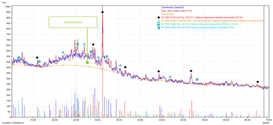 The diffraction pattern clearly shows two halos in the range of double angles of 10–16° (partially) and 17–36°. This indicates the presence of an amorphous phase. In addition, the presence of peaks in the diffraction pattern indicates the presence of crystalline phases, which are apparently subjected to partial melt, which is confirmed by the results of the melting of basalt [58].