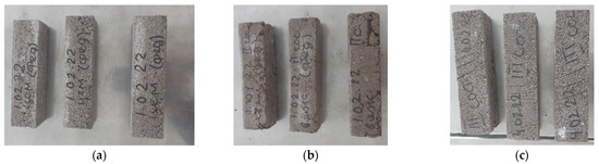 The determination of strength characteristics was carried out on samples from a cement–sand mortar with a composition of 1:3. The consumption of components is shown in Table 3.