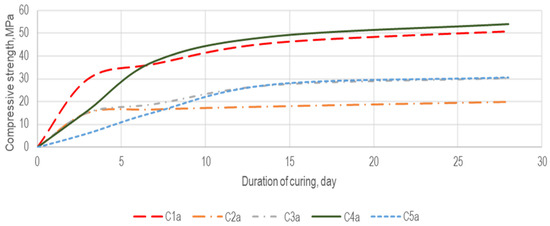 Curves of the kinetics of hardening compositions C1a, C2a, C3a, C4a and C5a, obtained from the results of non-destructive testing of compressive strength, are shown in Figure 6.