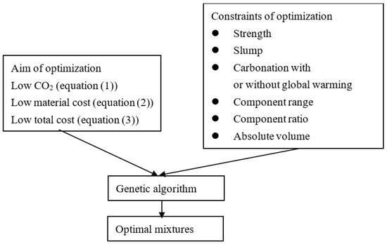 The flowchart of the genetic algorithm is presented in Figure 1. The goal was to optimize CO2 emissions, material cost, or total cost. The constraints of optimization considered were compressive strength, slump, carbonation, component range, component ratio, and absolute volume. After inputting the goal and constraints, the optimal mixtures for the design cases were determined.
