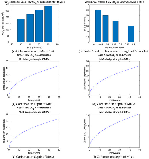 - Case 5 (low-total-cost concrete with carbonation and global warming) showed that, for Mix 17 (design strength of 30 MPa), global warming led to an increase in actual strength from 31.28 to 33.44 MPa. Thus, to fulfill the constraints of carbonation with global warming, a greater binder content or greater strength ought to be used. However, global warming was not found to influence the mixture design of higher-strength concretes (40, 50, and 60 MPa).