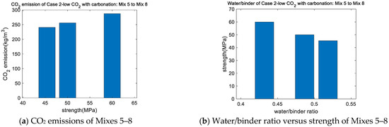 The genetic algorithm enabled us to identify mixtures with low CO2 emissions. The carbonation durability constraint was not considered in this case. The optimal mixtures for case 1 are given in Table 6, while their performance is presented in Table 7. The water content for Mixes 1–4 was similar due to the water/solid ratio constraint, which was toward the lower limit, whereas the SF/binder ratio was toward the upper limit. This is because the CO2 emissions are greater for 1 kg of cement than 1 kg of SF. When the goal of optimization was low CO2 emissions, the SF/binder ratio was pushed toward the upper limit. Additionally, as shown in Figure 2, as the strength of concrete increased, the CO2 emissions of concrete increased (Figure 2a), whereas the water/binder ratio decreased (Figure 2b), in accordance with [30,33,34].