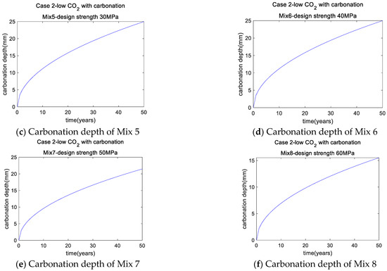 The carbonation depth over time of Mixes 1–4 is depicted in Figure 2c–f. Following a service life of half a century, the carbonation depths of Mixes 1 and 2 exceeded the cover depth limit of 25 mm (Figure 2c,d), whereas the carbonation depths of Mixes 3 and 4 were below this limit (Figure 2e,f). Thus, carbonation durability could be satisfied for high-strength concrete (Mixes 3 and 4 with 50 and 60 MPa, respectively), but not ordinary-strength concrete (Mixes 1 and 2 with 30 and 40 MPa, respectively).