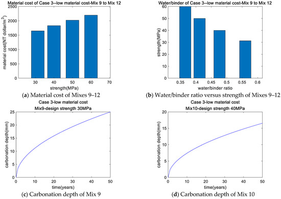 - Case 3 (low-material-cost concrete with carbonation) revealed that the SF/binder ratio was toward the lower limit for Mixes 9–12, due to the greater material price of SF compared to cement. Additionally, for Mix 9, the actual strength (31.28 MPa) was greater than the design strength (30 MPa), suggesting that carbonation dominated the mixture design. After 50 years of service life, the carbonation depth of Mix 9 was equal to the cover depth.