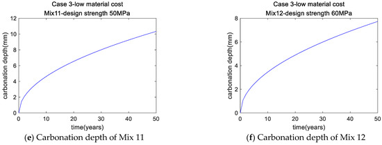 In the previous two sections, the goal of optimal design was low CO2. However, material cost is also a vital index of concrete sustainability. In this section, the material cost of concrete was taken as the goal of optimal design. Using the genetic algorithm, the optimal mixtures with a low material cost were calculated, as presented in Table 10. The performance of the optimal mixtures for Case 3 is outlined in Table 11. First, for Mixes 9–12, the SF/binder ratio was equal to the lower limit, as the material cost of SF is greater than that of cement. Second, for Mix 9, the design strength was 30 MPa but the actual strength was 31.28 MPa, suggesting that carbonation dominated the mix style of Mix 9. After 50 years of service life, the carbonation depth of Mix 9 was equal to the cover depth. Third, as shown in Figure 4, as the strength of concrete increased, the cost of material increased (proven in Figure 4a), whereas the water/binder ratio of concrete (Figure 4b) and the carbonation depth of concrete decreased (Figure 4c–f), in agreement with [32,33,34]. For Mixes 10–12, the carbonation depth after 50 years of service life was lower than the cover depth (Figure 4d–f, respectively).
